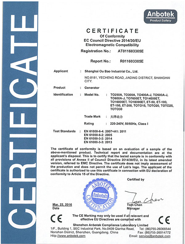 AT011603305E-歐鮑實(shí)業(yè)-發(fā)電機(jī)-CE證書 EMC